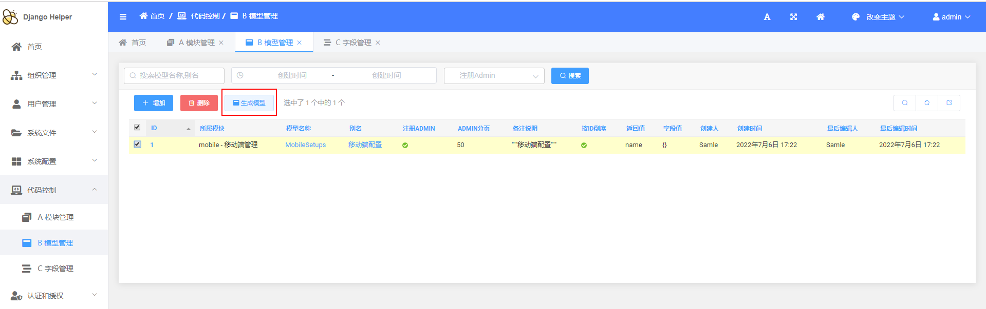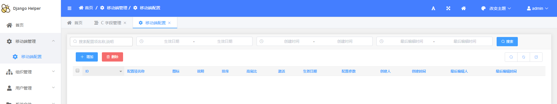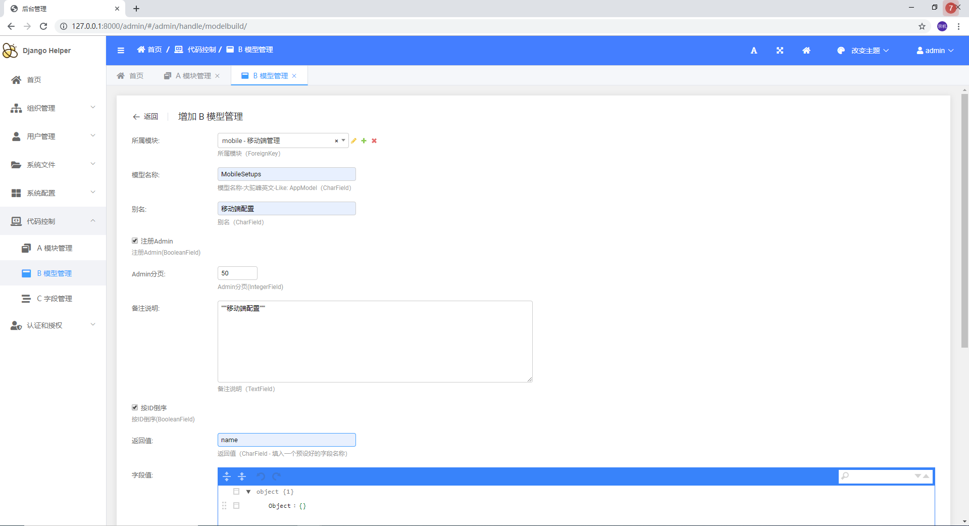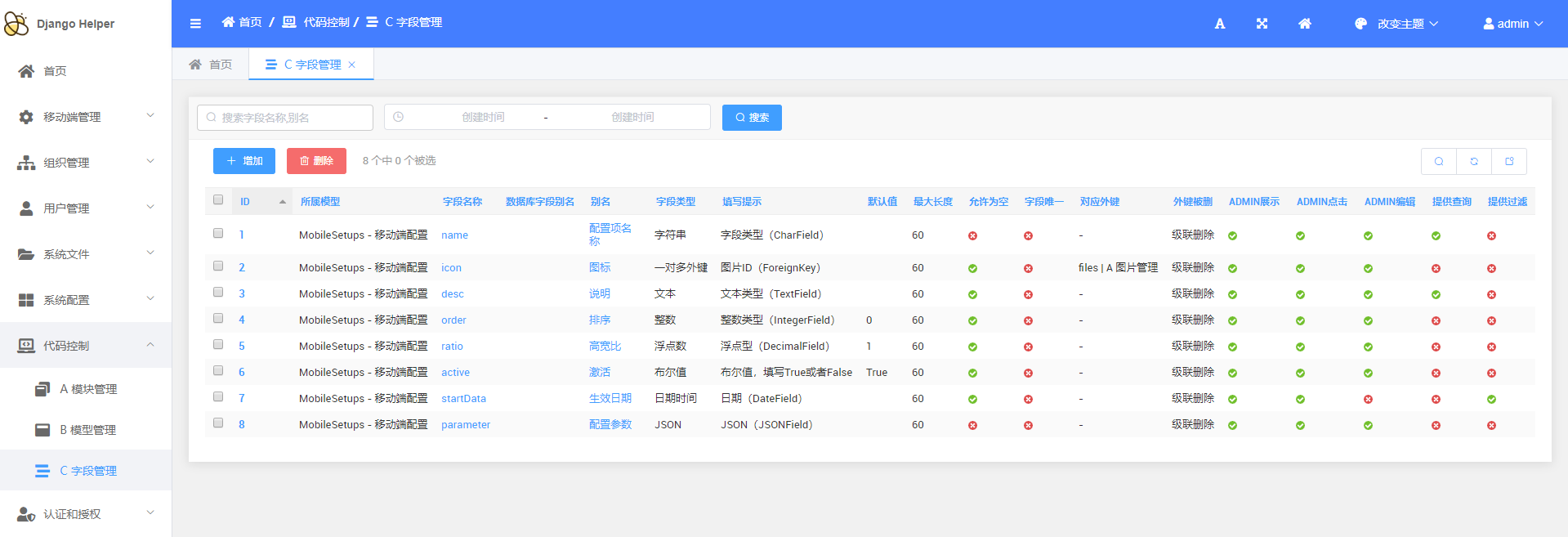 > `DjangoHelper`是一套基于Django的快速开发项目框架 > d 低代码CRUD 为了满足基础业务需要,实现了基础的代码生成功能 + 如图: + 原有的基础模块  + 原有的接口  + 通过后台进行配置 + 增加模块  + 增加模型  + 增加字段   + 通过后台进行生成 + 生成模块  + 生成表单模型、后台管理、基础接口  + 效果展示 + 终端执行效果  + 后台管理生成效果   + API接口生成效果   > d 基础通用配置 + 维护基础配置类目  + 维护类目下具体内容   + API生成效果  + 使用效果