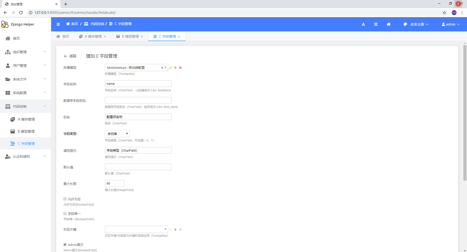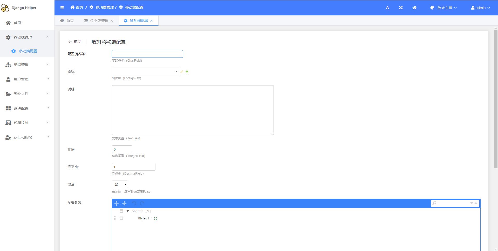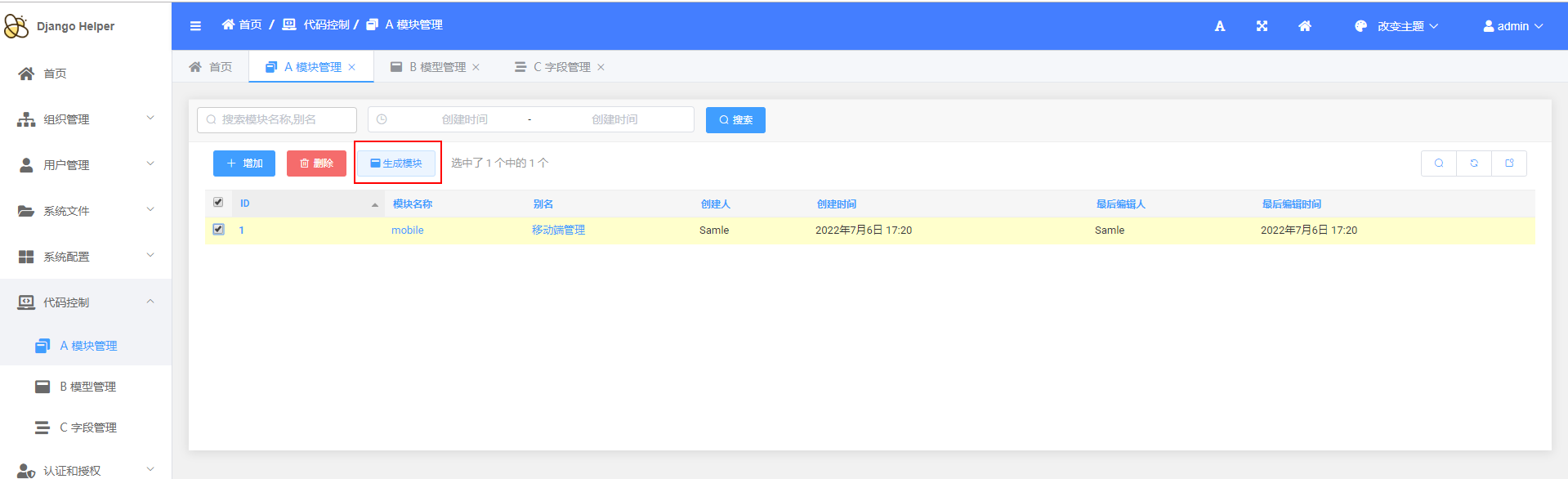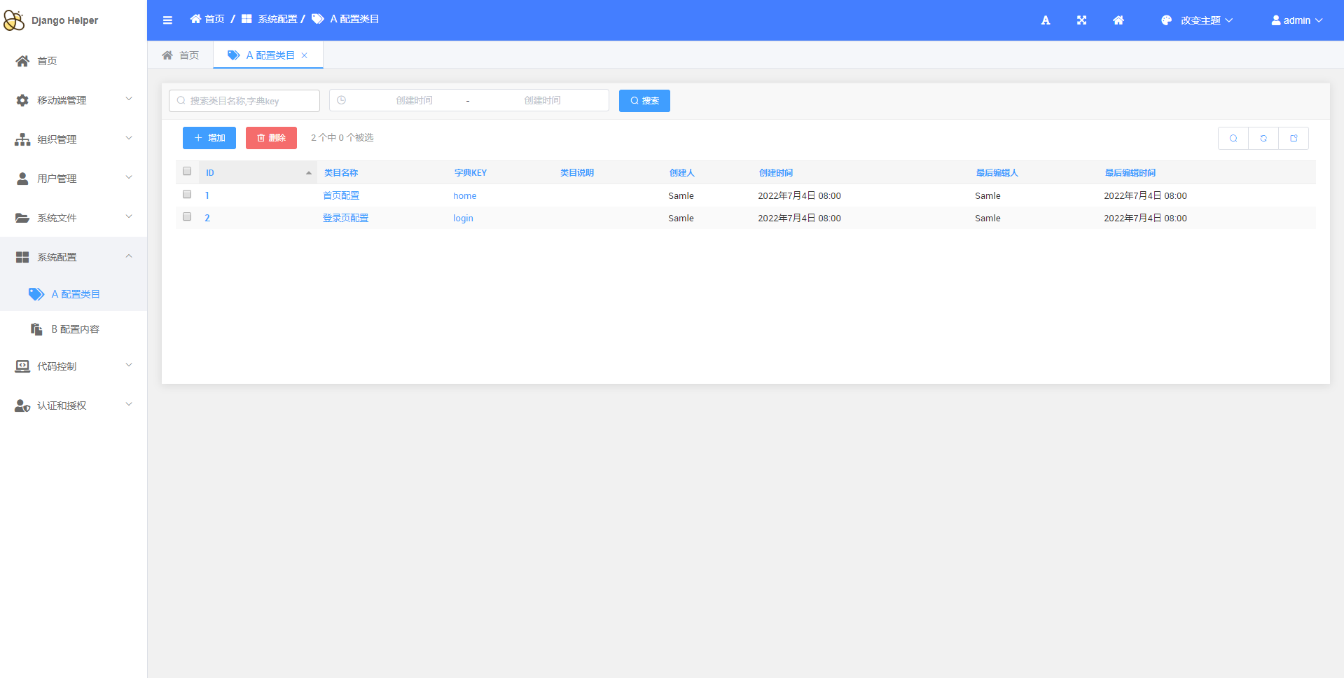 > `DjangoHelper`是一套基于Django的快速开发项目框架 > d 低代码CRUD 为了满足基础业务需要,实现了基础的代码生成功能 + 如图: + 原有的基础模块  + 原有的接口  + 通过后台进行配置 + 增加模块  + 增加模型  + 增加字段   + 通过后台进行生成 + 生成模块  + 生成表单模型、后台管理、基础接口  + 效果展示 + 终端执行效果  + 后台管理生成效果   + API接口生成效果   > d 基础通用配置 + 维护基础配置类目  + 维护类目下具体内容   + API生成效果  + 使用效果