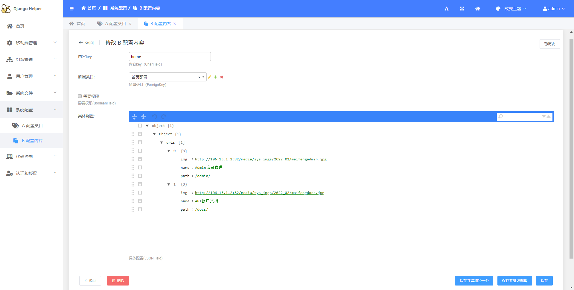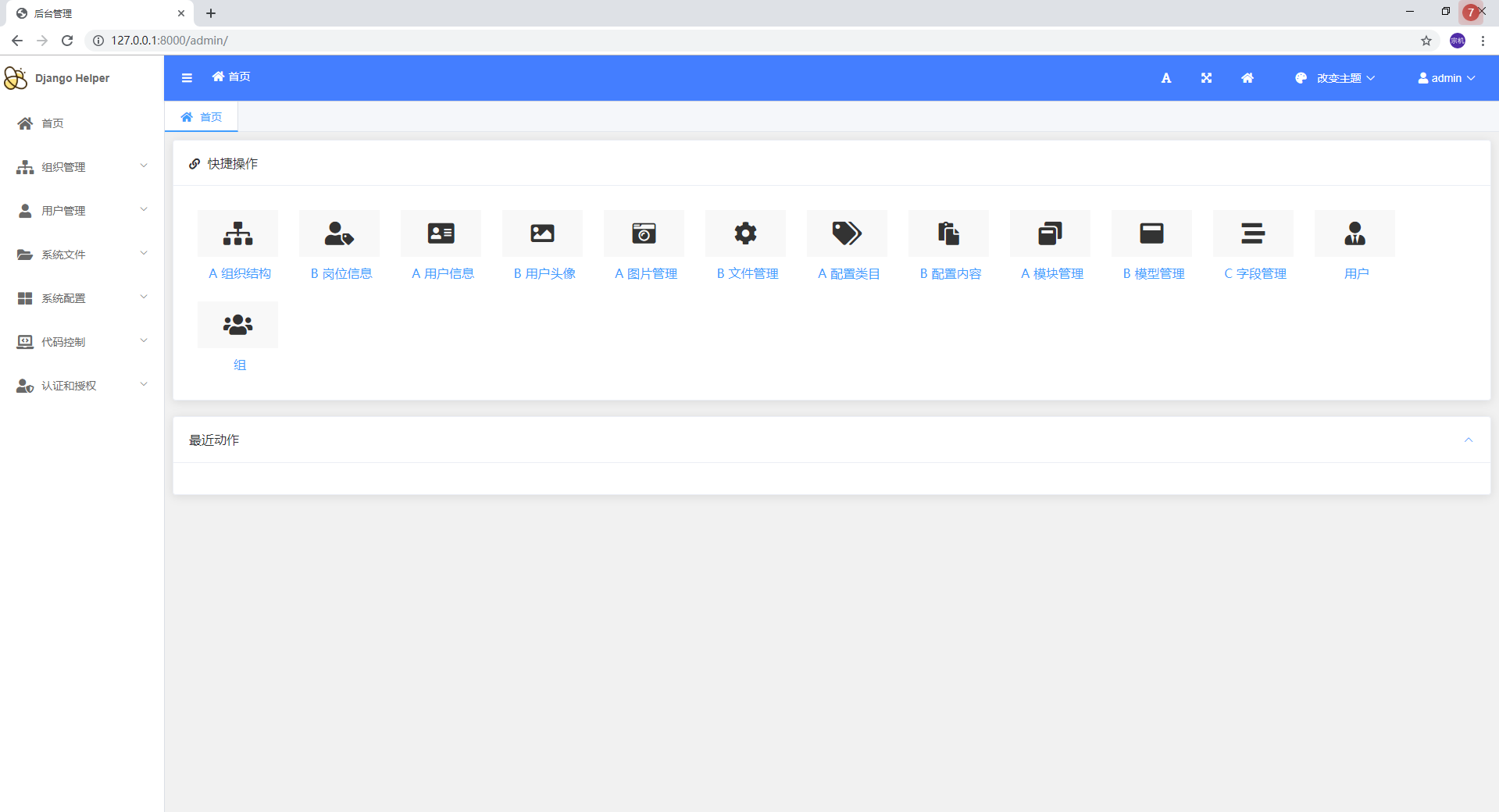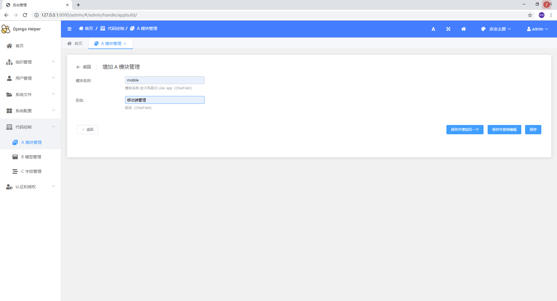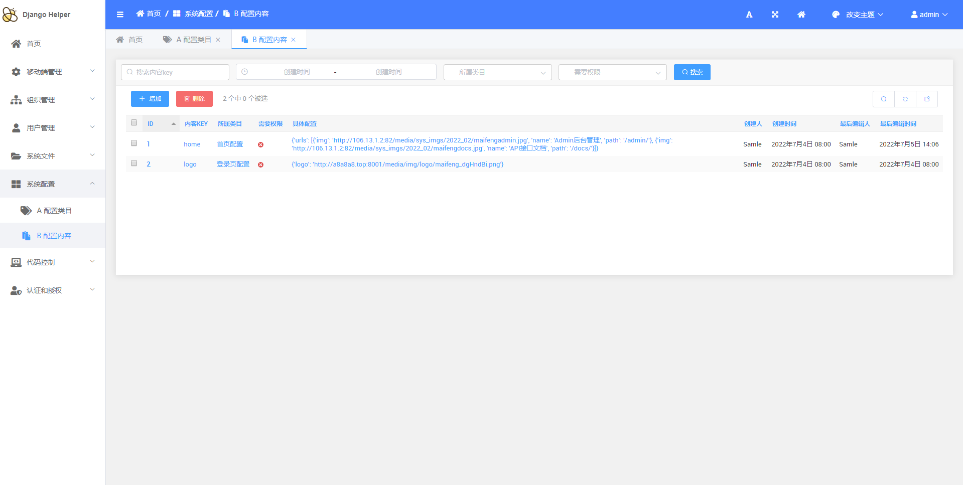 > `DjangoHelper`是一套基于Django的快速开发项目框架 > d 低代码CRUD 为了满足基础业务需要,实现了基础的代码生成功能 + 如图: + 原有的基础模块  + 原有的接口  + 通过后台进行配置 + 增加模块  + 增加模型  + 增加字段   + 通过后台进行生成 + 生成模块  + 生成表单模型、后台管理、基础接口  + 效果展示 + 终端执行效果  + 后台管理生成效果   + API接口生成效果   > d 基础通用配置 + 维护基础配置类目  + 维护类目下具体内容   + API生成效果  + 使用效果